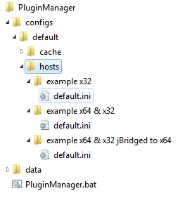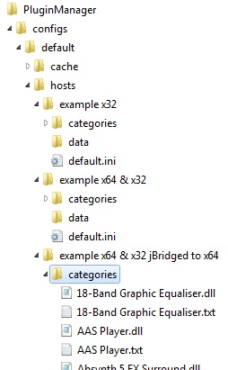 The Plugin Manager creates a "categories" subfolder in each host folder, which mirrors the category folder structure of ".\cache\categories\" and will create the desired plugin DLLs into it... (notice that these DLLs are either jBridge DLLs, or Loader DLLs (see above). Both jBridge and Loader DLLs need a .txt file with the same name, containing the path to the actual DLL it will bridge/load...) This "categories" folder" has to be specified in your host as Plugin Root Path. It will contain all your desired plugins. Whenever you install or update plugins, automap enable or disable plugins, create a new host within the Plugin Manager, edit .ini files for Plugin changes, or default.ini settings for hosts, then simply run the Plugin Manager. It will update all your hosts scan paths to reflect your changes to your system. |