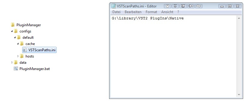 This is, what the "PluginManager"-Folder contains:![]() The "data" folder contains two so called loader DLLs. These are DLLs which are used in the generated hosts scan paths and do nothing else than loading the actual VST Plugin. Because these DLLs will be scanned by a Plugin hosting application, the DLLs can have any name, which will be visible in the host. The loader DLLs, when loaded by a host, will load the VST Plugin, wherever it may be installed in your system. The host will communicate directly with the VST Plugin. There will be no "wrapping" or "bridging" going on, so using the Plugin Manager won't have any impact on stability or performance! The "data" folder also contains a "html" file and a .jpg file, which is displayed using the Internet Explorer application, to show the progress of the Plugin Manager dynamically. However, if you don't have Internet Explorer installed, you still can use the Plugin Manager, but it can't present you its progress. Instead, there will be an occasional Message Box, which you have to confirm, or enables you to abort the program. The programm will then run "in the background". The "data" folder contains a PluginManager.vbs, a Visual Basic Script, which will do "all the magic...". Please don't alter any of these Files! The "configs" folder contains PluginManager "configurations". A configuration consists of any information the PluginManager will need to run and will gather while executed. All of this is covered below. You can create as many configurations as you want. Simply create another subfolder under "./configs". The PluginManager.bat will start the Plugin Manager, when doubleclicked (see executing the Plugin Manager below) (please don't start the tool multiple times concurrently, the script won't work in this case, you'll get vbs runtime errors) |