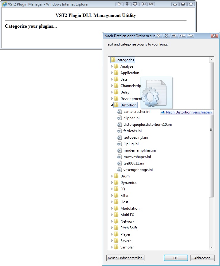 When the Plugin Manager found a new Plugin, it will stop and offer you the possibility to move the new .ini file to an appropriate category folder... You can use this dialog to create new category folders and move .ini files into category folders, or you can use the Windows Explorer to move .ini files of plugins around freely in your ".\cache\categories\" subfolders, as you like... When done categorizing, simply hit [ok]... You can move .ini files with the Windows Explorer anytime, even when the Plugin Manager isn't running, too. Changes will be reflected in your hosts scan paths as soon as you ran the Plugin Manager! |