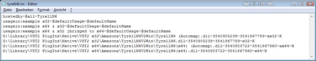 As mentioned, the Plugin Manager creates a .ini file for a VST Plugin. The .ini files all will look similar. Normally, you won't have to edit these .ini files. You just move them into category folders. You CAN however edit these files to influence the behaviour of the Plugin Manager for a given Plugin. In the following, I'll explain the structure of these .ini files for "TyrellN6": ![]() The first line in this file is called the "hostedBy"-line, where you specify in which Hosts (see above) the Plugin shall be available. The Plugin Manager automatically specifies "@all" when he creates a new .ini file for any plugin, which means that this Plugin will be available in each hosts scan path the Plugin Manager found a subfolder for in ".\configs\default\hosts". You can specify "@none" (this plugin shall be available in no Host). You can specify a dedicaated host (the name of the host subfolder), too, in which case the Plugin will only be available in the specified hosts scan path. The second field contains the name under which the plugin will be available to the host, no matter which plugin DLL is actually is used. Normally, the Plugin Manager will use the name of the native x32 Plugin (in this case "TyrellN6") for a given Plugin. For some Plugins, this won't do it. "Rapture LE" for example is available as "Rapture32LE.dll" and "Rapture64LE". The plugin will then be available as "Rapture32LE" in each host, even when the "Rapture64LE.dll" is being used by the host... In this case, simply edit the .ini file and specify a name, "Rapture LE" for example, so "Rapture LE" will be available in any host, no matter which DLL it actually uses! In no case delete the field separator, shown in the example .ini above with "-". These aren't "-" chars, but hex00 chars. Don't delete these chars and replace them with a "-"! If you accidentaly do, then simply delete the .ini file. The Plugin Manager will create a new one automatically... The following lines are "usageIn:"-lines, one line for each host. Here you can override the default "usage" (default.ini) for the plugin in a given host. When you for example discover that a given DLL won't simply work automap enabled currently, you can override the default usage "ax32" specified in the default.ini of the host, with a special usage here "x32" here. Or, if you specified "x64|x32" in the hosts default.ini, the plugin currently is only available as x32 DLL, and the given host does have problems with bridging it to x64 with its own bridge, you can specify "x64|j64x32" here. As soon as a x64 DLL will be available for that plugin, the x64 version will be used. Until then, the x32 DLL will be bridged to x64 using jbridge, which might work better than the hosts own bridge... You can specifiy "@none" here, too, which means that this Plugin shall not be available to this host. You could switch plugins availability in a given host on and off easily with this. The Plugin Manager always will create the entry "@DefaultUsage" here, which means that the usage specified in the "default.ini" for the host is being used. With the third field, you are able to give a plugin a special name for a given host, if you so desire. The Plugin Manager will create the entry "@DefaultName", which means that the name according to the hostedBy-line is being used, but you can alter this to your liking. The following lines contain information about the DLLs the Plugin Manager found for a given plugin. Don't alter these lines. Whenever you change one or more .ini files, simply run the Plugin Manager to update the hosts scan paths according to the new information. |